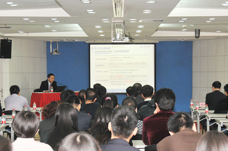 張總裁在會(huì)議上做了2014年年度工作報(bào)告及2015年工作安排,全面客觀地回顧了一年來公司各項(xiàng)工作進(jìn)展情況,發(fā)現(xiàn)問題,總結(jié)得失,并根據(jù)戰(zhàn)略規(guī)劃部署了新一年重點(diǎn)工作任務(wù)。2014年是公司進(jìn)行戰(zhàn)略轉(zhuǎn)型的第一年,在“抓住機(jī)遇、提質(zhì)增效”的指導(dǎo)思想下,圍繞抓好融資結(jié)構(gòu)升級(jí)和風(fēng)控手段創(chuàng)新兩個(gè)著力點(diǎn),加快干部隊(duì)伍建設(shè)梯隊(duì)化和年輕化步伐,構(gòu)建了“業(yè)務(wù)行業(yè)化、融資多元化、風(fēng)控專業(yè)化”的經(jīng)營(yíng)新格局。