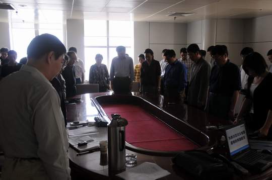 5 月 19 日 ,下午 2 : 28 舉國默哀三分鐘。河北金租會議室,默哀氣氛莊嚴肅穆,只聽窗外汽笛齊鳴,于是心有感念:愿生者堅強振作,早日重建家園,死者則安心長眠,天堂沒有地震。